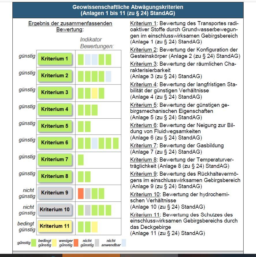 Für die 90 Teilgebiete wurde ganz grob festgestellt, dass keine grundsätzlichen Ausschlusskriterien vorliegen und sie die Mindestanforderungen erfüllen können. Dann wurden auch ganz grob die sog. 11 geologischen Abwägungskriterien angewandt.
